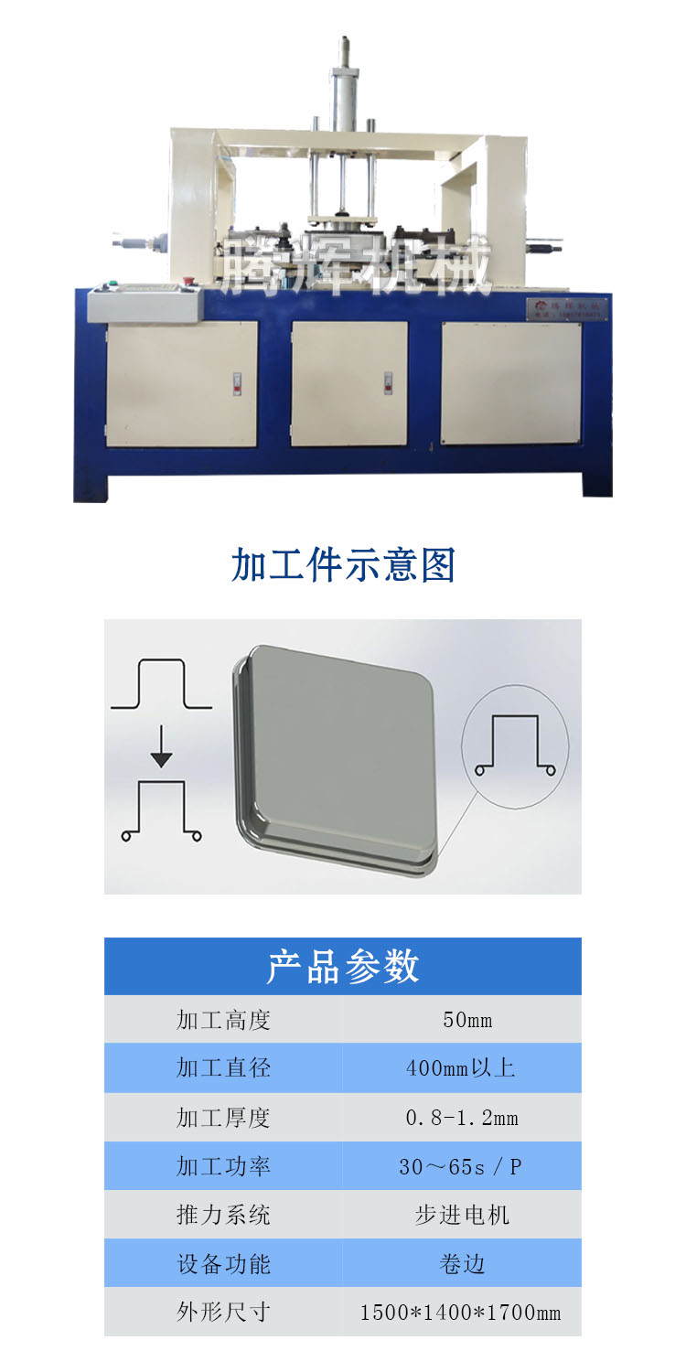 本文介紹的是用于長方形盤子產(chǎn)品加工設(shè)備異形卷邊機,首先將加工件放在模具上,按一鍵啟動后模具旋轉(zhuǎn),卷邊工位進刀,跟隨模具旋轉(zhuǎn)施壓加工件的邊緣受壓向內(nèi)卷邊。可任意選擇手動/自動操作,具有操作方便,性能穩(wěn)定。(公司根據(jù)客戶需求,為客戶量身定制適合的設(shè)備,歡迎新老客戶咨詢了解)