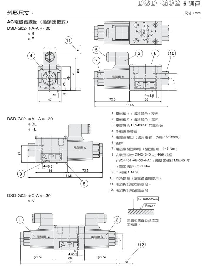 o 適用于ISO,CETOP,NFPA和DIN國際標準之安裝面。